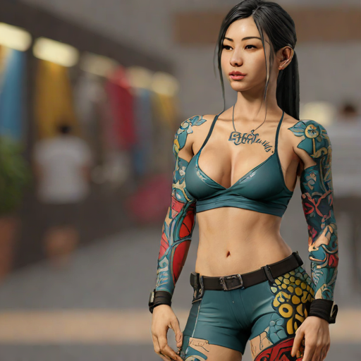 Lin Chen, 19, Chinese woman with tattooed / superhero physique style. adventurous & experienced. lawyer.