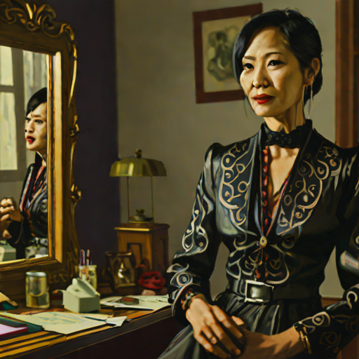 Ruby Young, 55, Southeast Asian woman with chic / goth style. romantic & passionate. scientist.
