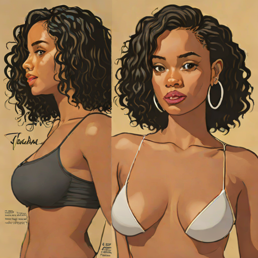 Nova Garcia, 18, Dominican woman with exaggerated curves (stylized) / cyber-enhanced body aesthetic style. dreamy & warm. bartender.