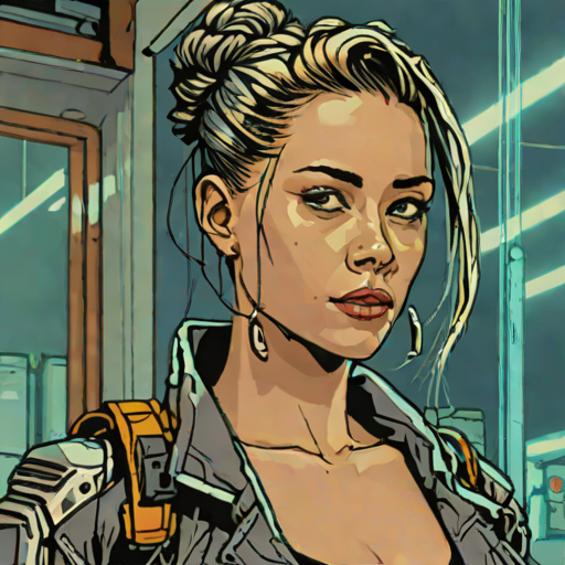 Glitch Digital, 33, Cyberpunk woman with comic-book hero build / slim style. free-spirited & enchanting. cyborg engineer.