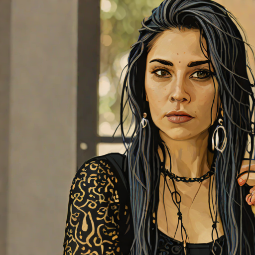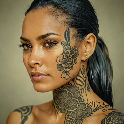 Nora Flores, 34, Maldivian woman with cyber-enhanced body aesthetic / tattooed style. open-minded & smoldering. tattoo artist.