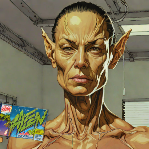 Zara Miller, 44, Alien woman with muscular / comic-book hero build style. forbidden & sarcastic. resistance fighter.